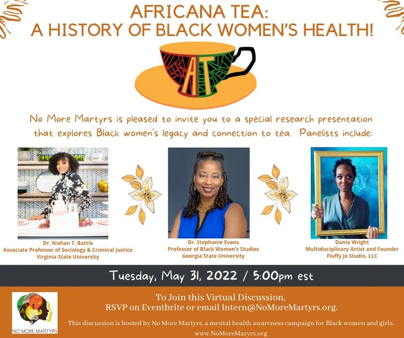 Join NO MORE MARTYRS for tea! This organization, founded by Dr. Nadia Richardson, is a mental health awareness campaign for Black women and girls. Eventbrite information: https://www.eventbrite.com/e/africana-tea-a-history-of-black-womens-health-tickets-325921549127